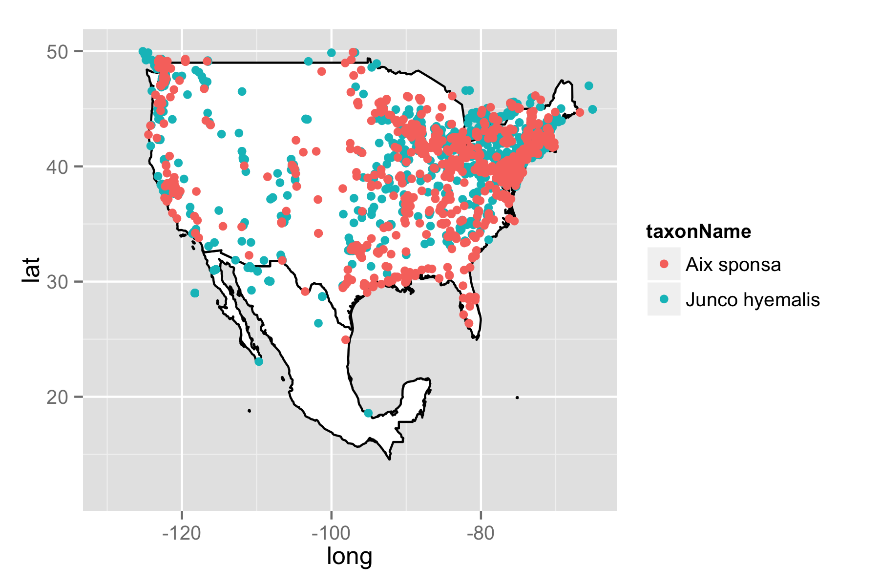 One of our primary goals at ROpenSci is to wrap as many science API’s as possible. While each package can be used as a standalone interface, there’s lots of ways our packages can overlap and complement each other. Sure He-Man usually rode Battle Cat, but there’s no reason he couldn’t ride a my little pony sometimes too. That’s the case with our packages for GBIF and the worldbank climate data api. Both packages will give you lots and lots of data, but a shared feature of both is the ability to plot spatial information. The rWBclimate package provides a robust mapping ability on top of access to climate data. At it’s most bare bones, it can be used as alternative to the built in mapping facilities included in rgbif. Building on the example in the rgbif tutorial we’ll plot data for two species in the US and Mexico, the dark eyed junco (Junco hyemalis) and the wood duck (Aix sponsa). Here’s how you can use the kml interface from rWBclimate to download a map of the US and Mexico and overlay it with data from rgbif.
