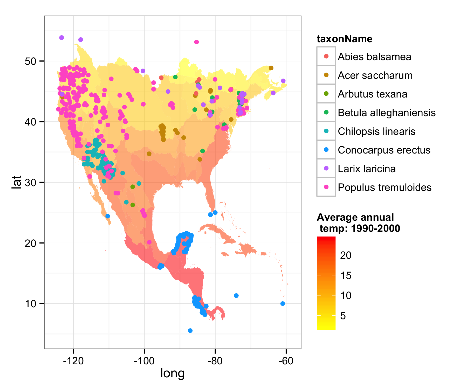 So that’s how you could make a basic map, but what if you want to overlay climate data with occurrence data? That’s easy too. You repeat essentially the same steps as above, but be sure to grab some climate data too. In this example I’ve chose to grab data for 8 different tree species that exhibit somewhat of a lattitudinal gradient. I’ll map them on top of historical temperature data. In this case I’ll be using the average annual temperature from 1990 to 2000. Because I want a bit better spatial resolution I’ll be using basin level data instead of country level data.
