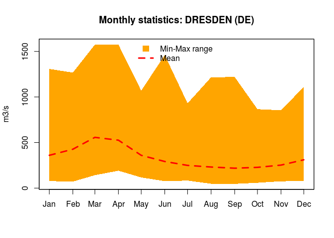 The oldest stastion is in Dresden on the Elbe River. Let’s now find out whether monthly data is available. For this we need the GRDC identification number (this is stored in the column grdc_no of the catalogue) and the function tsGRDC().