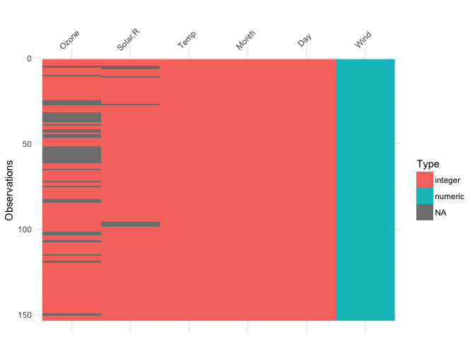 This shows us a visual analogue of our data, the variable names are shown on the top, and the class of each variable is shown, along with where missing data.