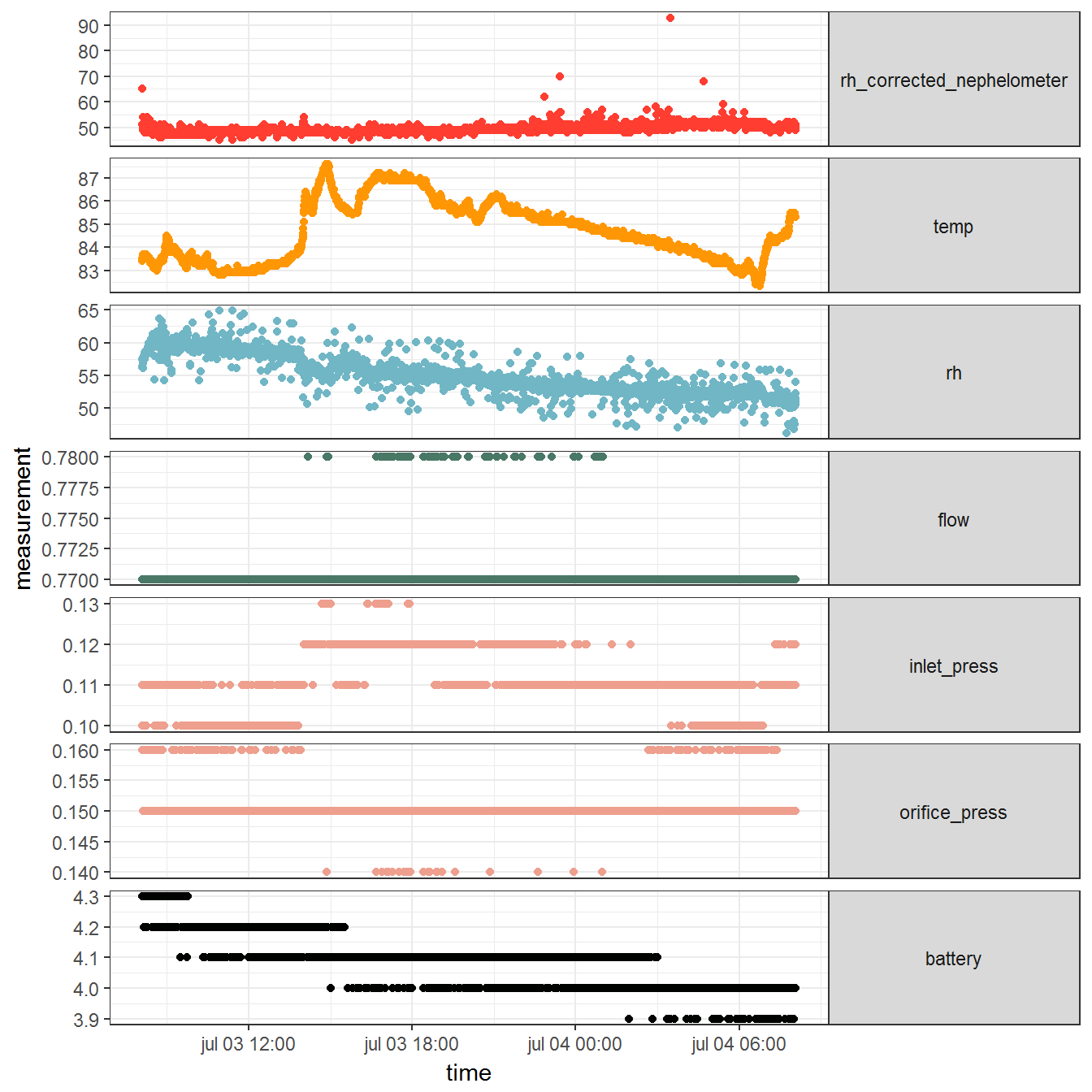 As mentioned previously, we experienced issues with MicroPEM data quality. Although we had heard other teams complain of similar problems, in the literature there were very few details about data cleaning. We decided to gather information from other teams and the manufacturer and to document our own decisions, e.g. remove entire files based on some criteria, in a vignette of the package. This is our transparent answer to the question “What was your experience with MicroPEMs?” which we get often enough from other scientists interested in PM2.5 exposure.