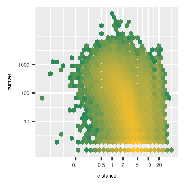 Distances can then be visually related to trip numbers to reveal their distributional form. These matrices contain too many values to plot directly, so the hexbin package is used here to aggregate in a ggplot.