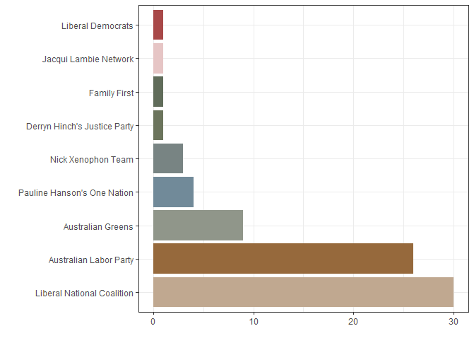Results of the 2016 Australian election to the senate, coloured by political party using the parliament palette. The colours for this palette were taken from the tapestry by Arthur Boyd found in the Great Hall of Parliament House.