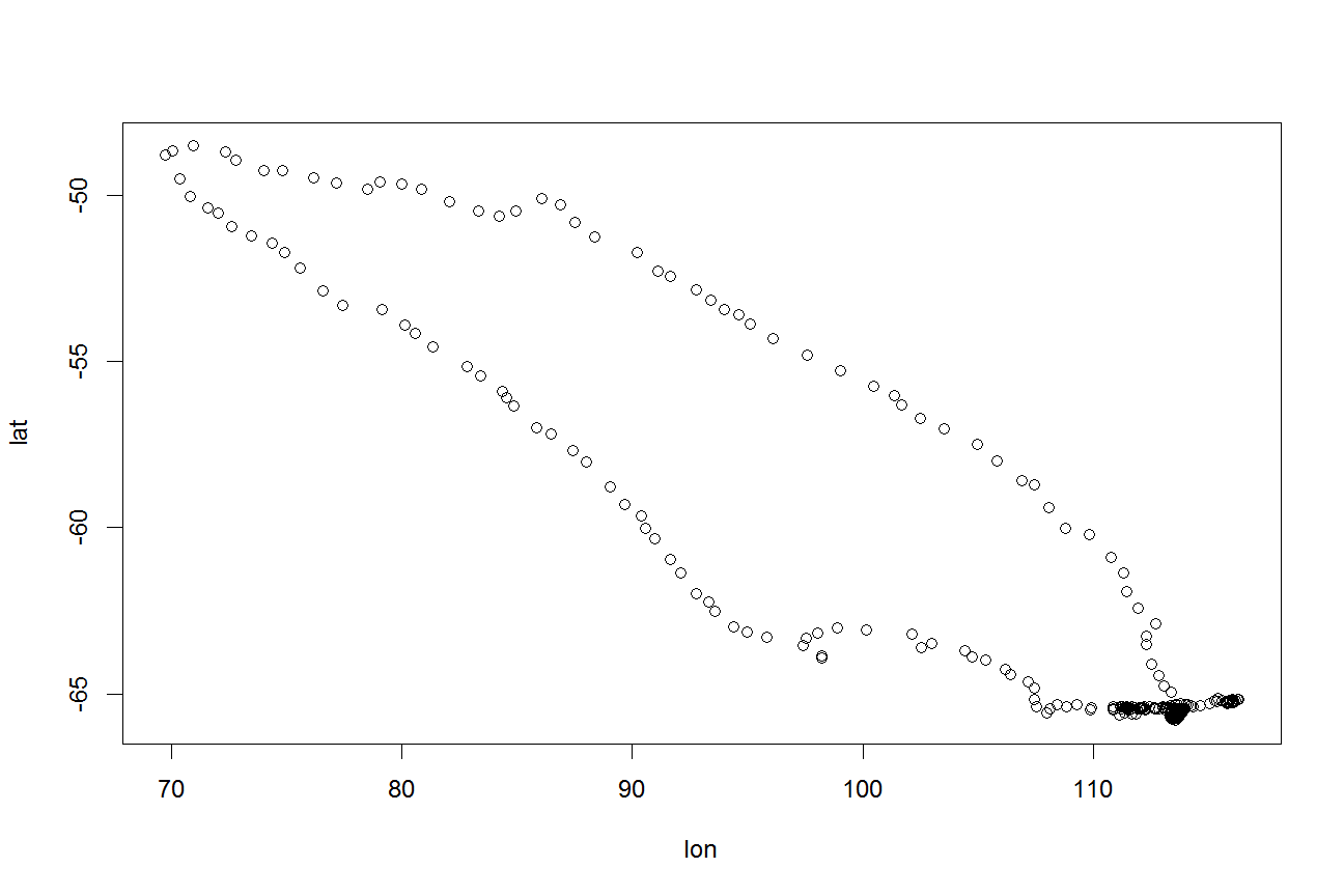 Let’s say that we have some points of interest in the Southern Ocean — perhaps a ship track, or some stations where we took marine samples, or as we’ll use here, the track of an elephant seal as it moves from the Kerguelen Islands to Antarctica and back again (Data from IMOS 20181, provided as part of the SOmap package).